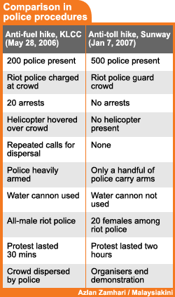 当时警方只是在一旁监视,不过并未干扰示威群众。这场大型的示威行动,不但没有示威者遭逮捕,也没有出现犹如去年5月反燃油涨价般的“血腥星期天”流血事件。