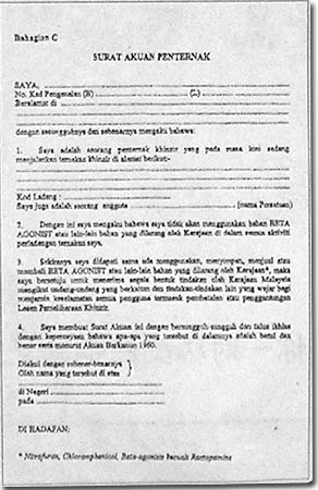 不过,禽总生猪组主任张鸿财日前曾表示,若要猪农签署这份宣誓书(左图), 就必须列明这项协议书所提到的“其他药物”;同时猪农也害怕遭有心人迫害,才拒绝签署。不过,新出炉的的猪农宣誓书已注明其他药物的种类。