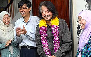 日前受邀前来马发表演讲的施明德(左一),今日是受邀与公正党众领袖进行交流后,受媒体询及在台湾的街头示威是司空见惯,但在马来西亚的示威却经常受到执政者以暴力镇压,施明德笑着回应说,20年前的台湾也是这个样子。