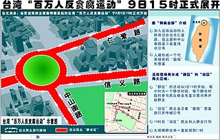 “后来我想到了一个办法。我要求每个人去邮政局交100块新台币的承诺金(大约11令吉),数目不大。问题是,你要到邮政局去,那时8、9月份的天气很热,中午要去排队是很麻烦的。所以,我在内部讨论时,每个人都说是不可能的。而且我要100万人,如果没有100万人,我就不带领大家走上街头。因为上万人没有意义,我要100万人,每个人100块钱。我的那些老朋友们说大概是不可能的,他们说50块好不好?甚至有些说10块好不好?或者是50万人、10万人就好。我说不可以,而且如果不在1个月内达到这个数字,我就不带领大家走上街头。”