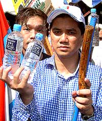 虽然老天在双方的叫骂声中下起大雨,但是非但浇不熄现场的火辣气氛,双方支持者反而逐渐失控,就在警方与镇暴队试图将两边人马推回各自的地盘时,不知哪一方开始发动“丢水瓶”攻势,结果双方顿时陷入了一场互抛矿泉水瓶和木棍的混战中。