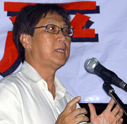 在陆庭谕演讲之前,去年为了捍卫学术尊严愤而辞职的林德宜(左图),也在昨晚放下学术人员的身段,以一口半咸不淡的福建话,发表了草根又直接的两分钟政治演讲。