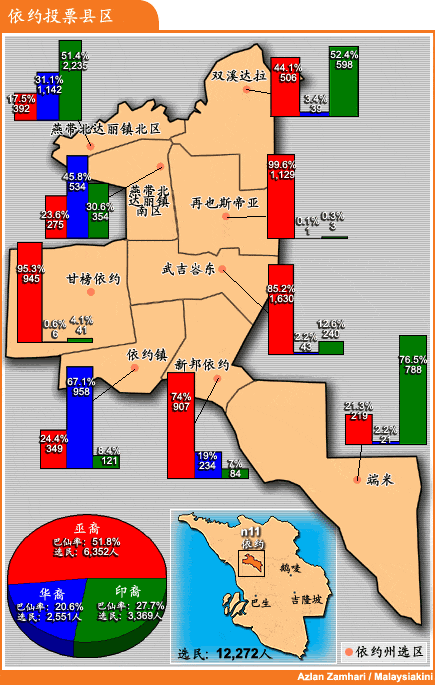 燕带北达丽镇南区及依约镇是华裔选民占多数的投票县区,而端米则是印裔选民占多数的县区。