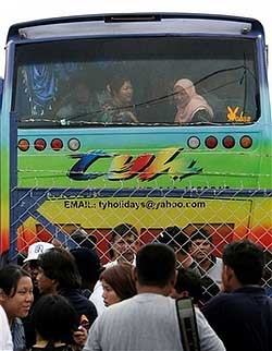 (九)4月28日下午3时30分在武吉峇东,欲阻止两辆疑是幽灵巴士离开的公正党支持者,受到国阵支持者的暴力对待。(参考 照片 )
