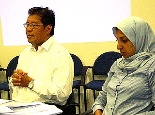 公正党依约补选候选人卡立依布拉欣(Khalid Ibrahim,左者)与公青团宣传主任拉蒂花(Lateefa Koya,右者)今早在吉隆坡党总部举行记者会,公布该党所收集到的照片与录影,力证国阵领袖与支持者才是在补选期间不断采用暴力手段竞选的一方。
