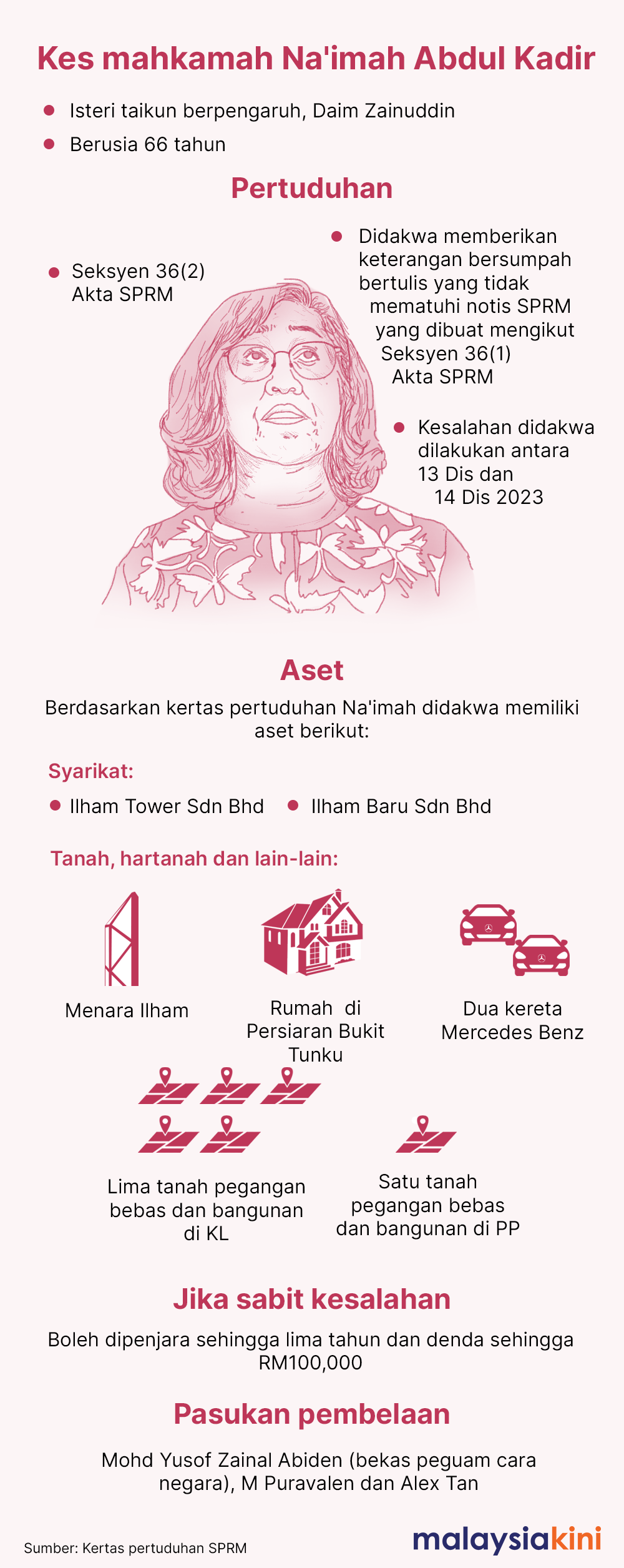 Na’imah, 66, turut didakwa gagal mengisytiharkan pemilikannya terhadap Menara Ilham di Kuala Lumpur serta dua unit kereta Mercedes Benz masing-masing model EQC 400 dan 500 SL.