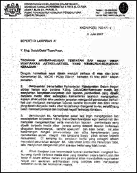 《当今大马》今日再次获得这封由国安部属下刊物管制及可兰经小组秘书仄丁尤索(Che Din Yusof)代表国安部秘书长所签署的公函。 (点击放大阅读7月3日最新公函全文)