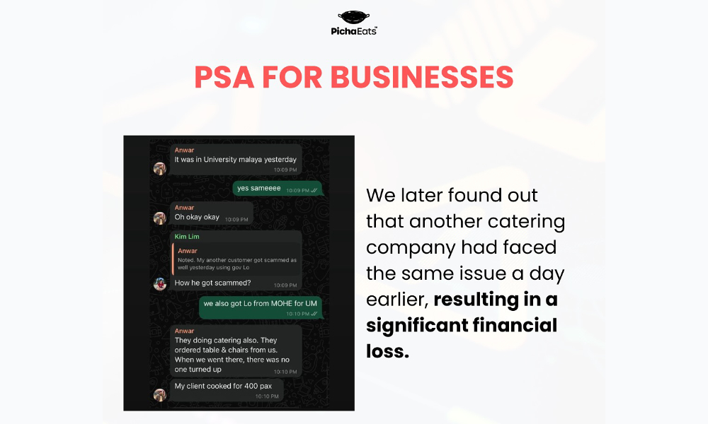 Sebagai pengumuman perkhidmatan awam, PichaEats menggesa rakan perniagaan untuk menyemak mesej daripada sebarang nombor telefon yang mencurigakan di laman web semakmule Polis Diraja Malaysia.