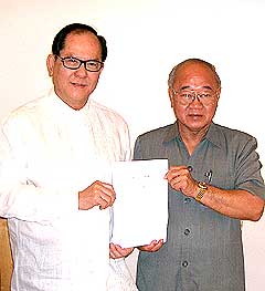 福联控股前任领导人林玉唐(右者)和黄美才在联合声明中表示,近几个月来福联控股售地风波由于董事会的决策失宜,引起了小股东的不满,而闹得对簿公堂,也招致媒体的广泛报道,不但使福建人脸上无光,也是华社的不幸。