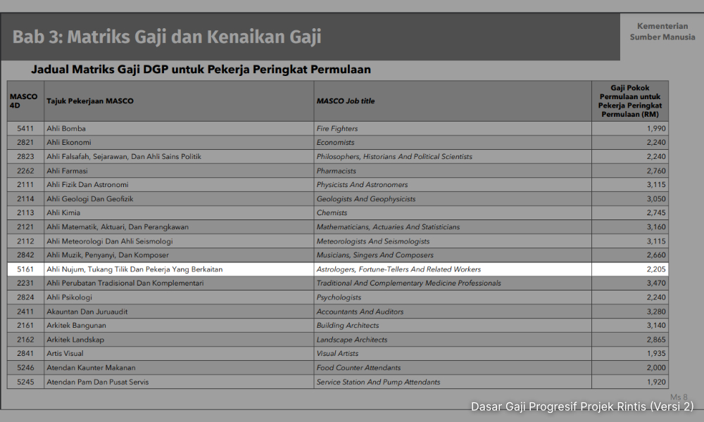 Pelaksanaan Dasar Gaji Progresif menunjukkan tangga gaji ahli nujum itu tersenarai bersama tukang tilik di bawah kod MASCO4D 5161.