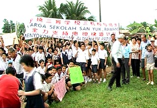 今早这场历时一小时的请愿,也重演昨日三育华小一群约四五十名学生在校园高举双手及高喊“停建、停建!”的“小学生请愿”情况。不过这次的阵容比较强大,共有约200名三育华小的小学生,齐声高喊十多声反对建筑高压电缆的口号。