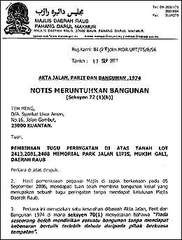 岂料,在9月17日劳勿县议会主席竟然向墓园圆主发出通知书,援引1974年道路、沟渠和建筑物法律第72(1)(b)条文,限期在14天内圆柱必须自行摧毁上述公墓,否认限期过后,等于自动要求县议会执行有关的毁墓工作。