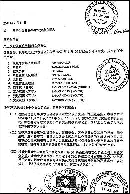第三封志期今年8月30日的书函(右图),是由韩春锦致给蕉赖区会主席和秘书,指最近接获该区会委员有关成立10个新支会的投诉,指示该区会必须对有关新支会重新讨论与商议,确保新支会是在符合程序下成立。
