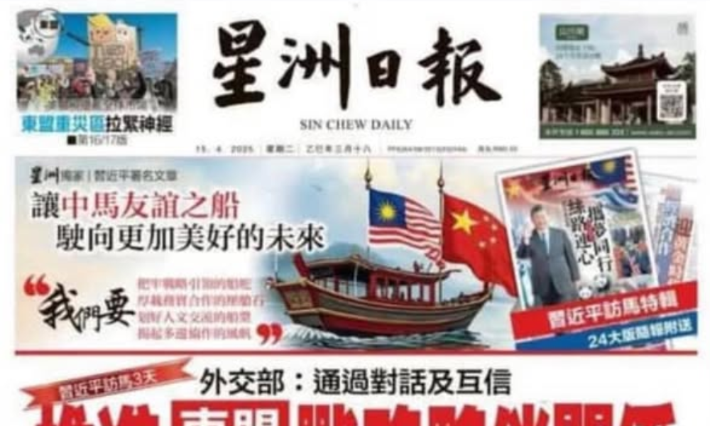 Selasa lalu, Sin Chew Daily menerbitkan ilustrasi sebuah jong di muka depan yang memaparkan bendera Malaysia dan China, sempena lawatan rasmi Presiden China Xi Jinping ke negara ini.