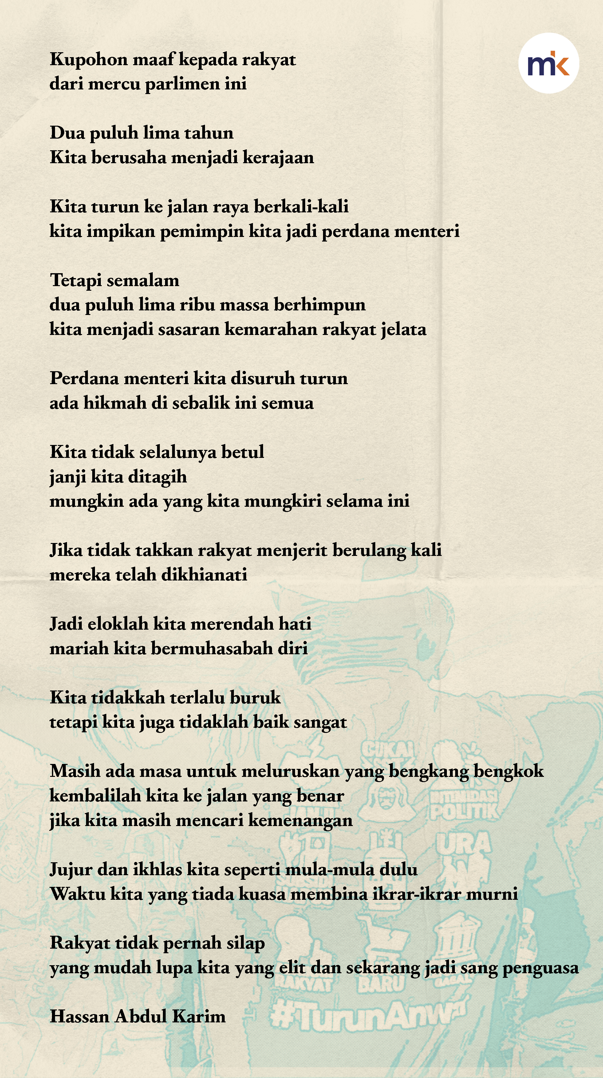 Hassan dalam satu sajak yang dihasilkannya turut memohon maaf kepada rakyat kerana mungkin ada janji yang dimungkiri selama mentadbir.