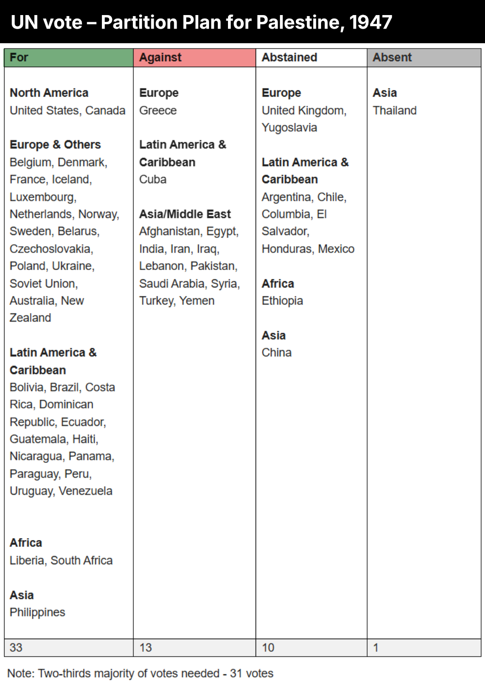 At the time, the UN itself was dominated by colonial powers. Much of Africa and Asia was still under colonial rule and had no say in the matter. Of the 57 member states then in the UN, 33 voted for partition, 13 voted against, and 10 abstained. A two‑thirds majority - 31 votes - was required, so the plan passed.