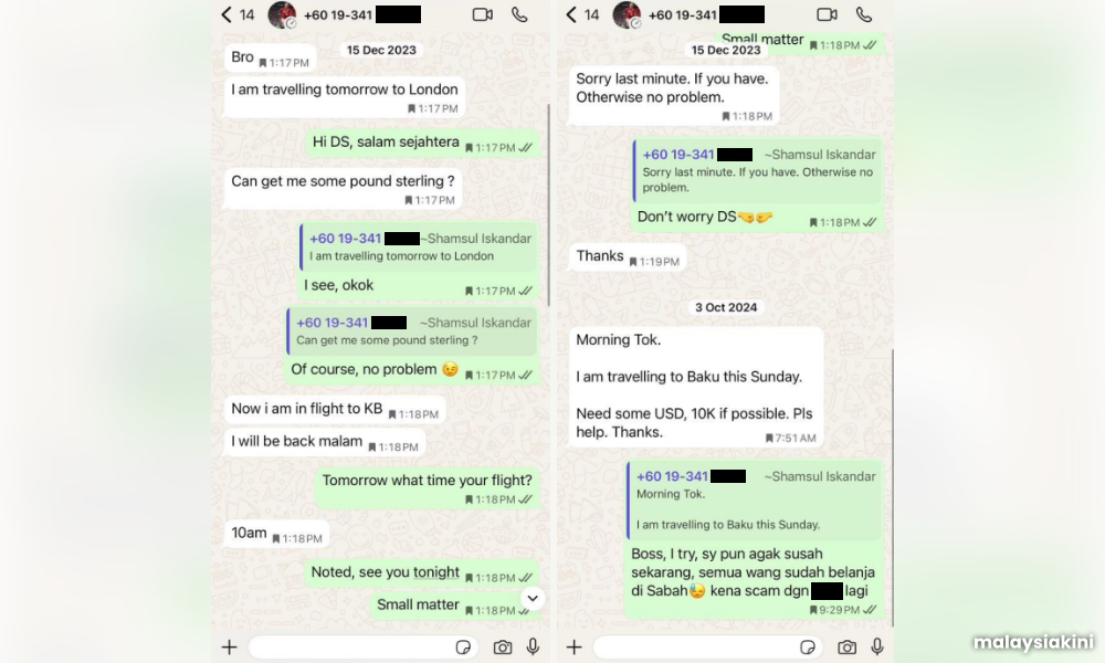 Tei turut memberikan Malaysiakini tangkap layar perbualan WhatsApp dari Disember 2023, yang didakwa menunjukkan Shamsul meminta wang semasa melancong ke luar negara.