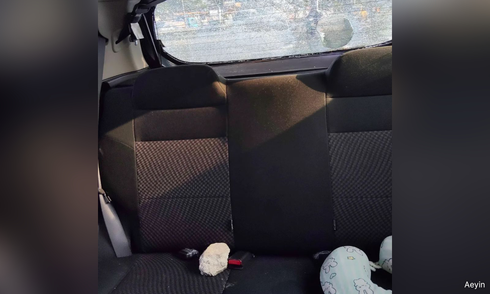 “Bunyi retakan cermin besar belakang kereta saya amat kuat, apabila saya toleh belakang, tempat duduk belakang kereta saya ada batu besar dan serpihan kaca,” ceritanya.