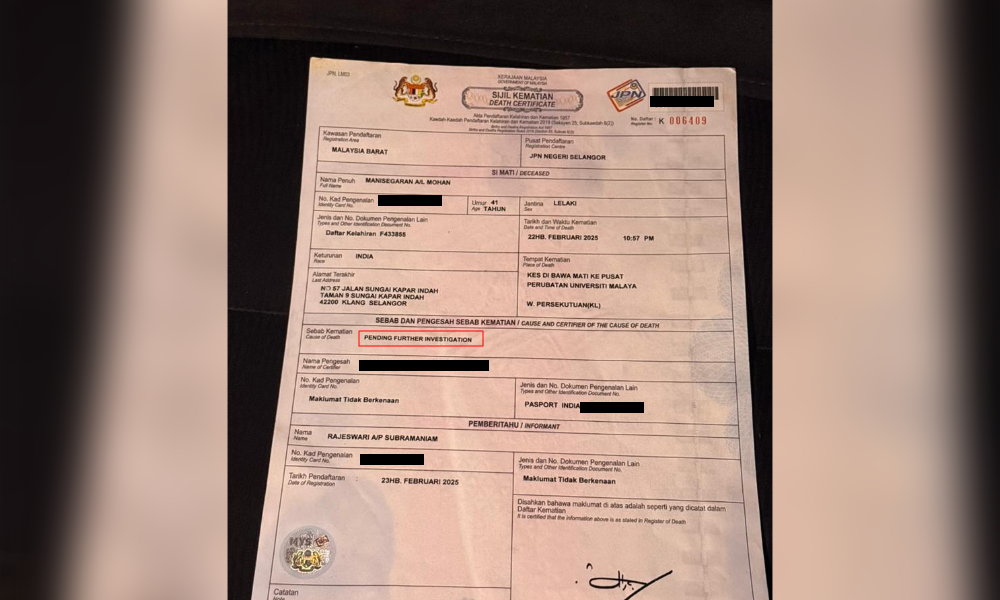 Sementara, sijil kematian itu menyatakan tempat kematian sebagai: "Kes dibawa mati ke PPUM" yang membawa maksud individu mati sebelum dibawa ke hospital.