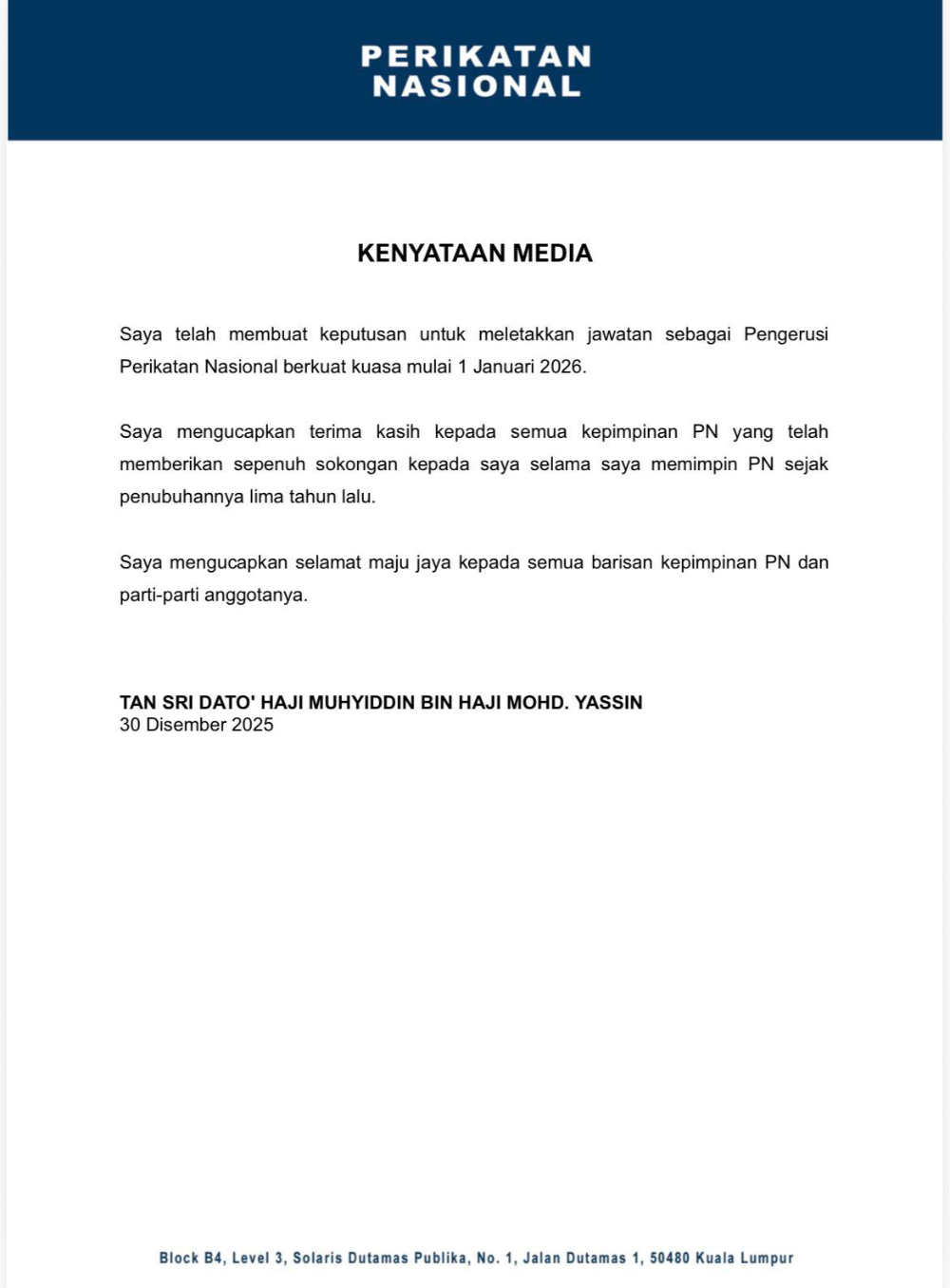 Presiden Bersatu Muhyiddin Yassin mengesahkan telah meletakkan jawatan sebagai pengerusi PN melalui satu kenyataan rasmi ringkas.
