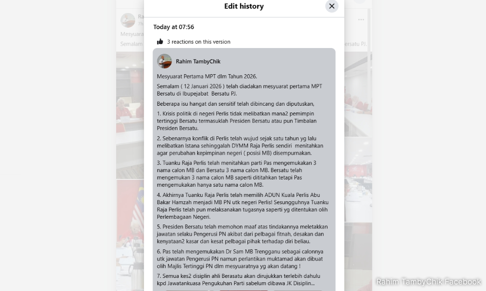 Rahim kemudian meminda hantaran berkenaan dengan menggugurkan semua butiran mengenai apa yang dibincangkan dalam mesyuarat malam tadi, namun kandungan asalnya masih dapat dilihat menerusi ‘sejarah suntingan’ Facebook.