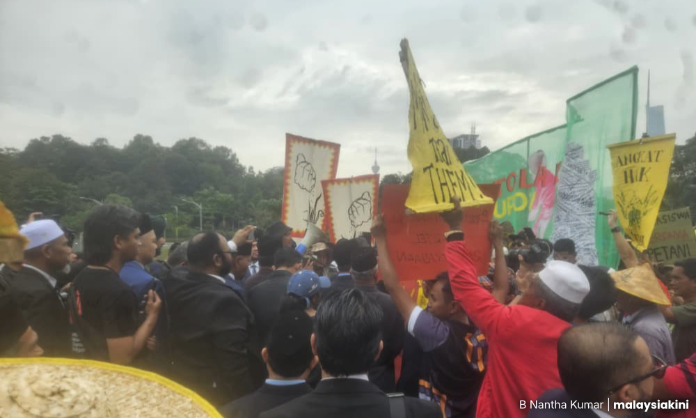 Para hadirin membawa pelbagai plakad yang tertera slogan "Angkat Hak Petani", "Mahasiswa bersama petani", "Petani bukan pemalas" dan "Tolak Upov".