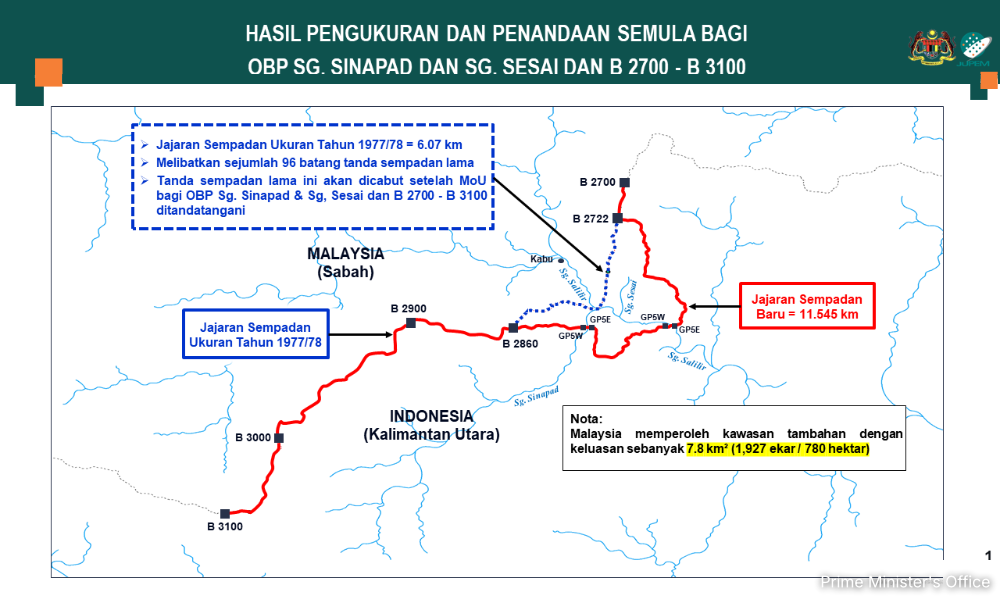 Perdana Menteri berkata keseluruhan kawasan pertikaian di OBP Sungai Sinapad-Sungai Sesai dalam kawasan OBP B2700-B3100 berjumlah 5,987 hektar dan kawasan itu sememangnya berada di kawasan pentadbiran Indonesia