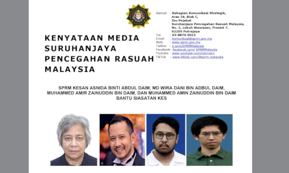 “SPRM menegaskan semua individu adalah tertakluk kepada prinsip kedaulatan undang-undang dan dilayan secara adil tanpa mengira latar belakang atau kedudukan dan menyeru keempat-empat individu berkenaan supaya hadir ke Ibu Pejabat SPRM, Putrajaya dengan segera bagi membantu siasatan dan mengelakkan sebarang tindakan lanjut menurut peruntukan undang-undang yang berkuat kuasa,” menurut kenyataan itu.