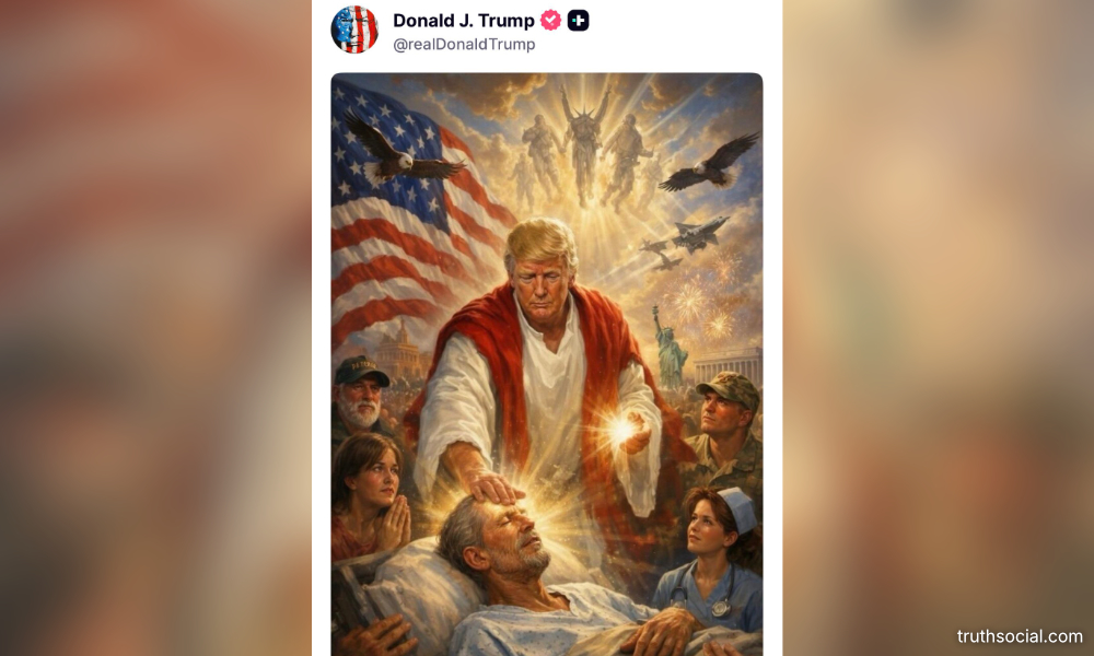 Imej yang dimuat naik di platform Truth Social milik Trump memapatkannya berjubah merah dan putih yang labuh, menyentuh dahi seorang lelaki yang kelihatan sedang sakit dengan cahaya bersinar dari tangan dan kepalanya.