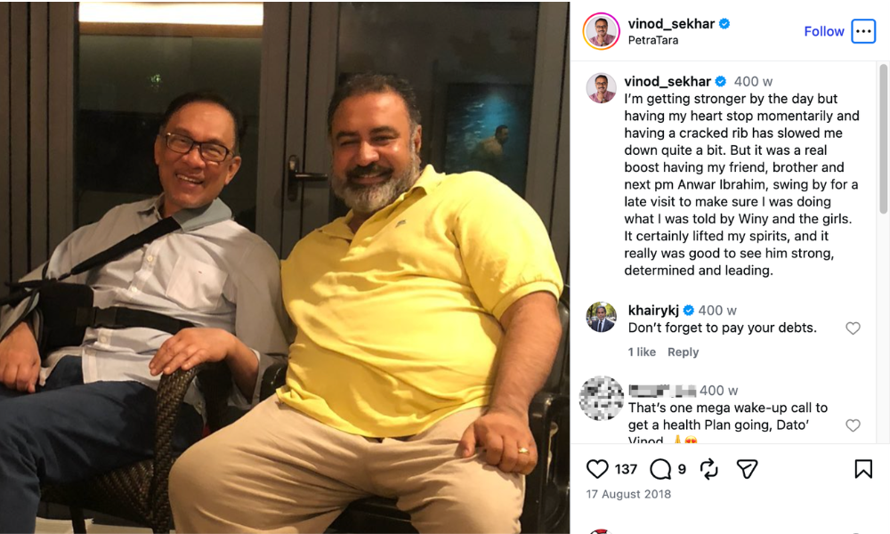 Untuk rekod, Anwar yang juga Pengerusi PH – dalam dalam afidavit mahkamah minggu lalu – menafikan mempunyai hubungan rapat dengan Vinod yang terlibat dalam saman RM30 juta difailkan oleh sekumpulan pelabur multinasional dan bekas pekerja.