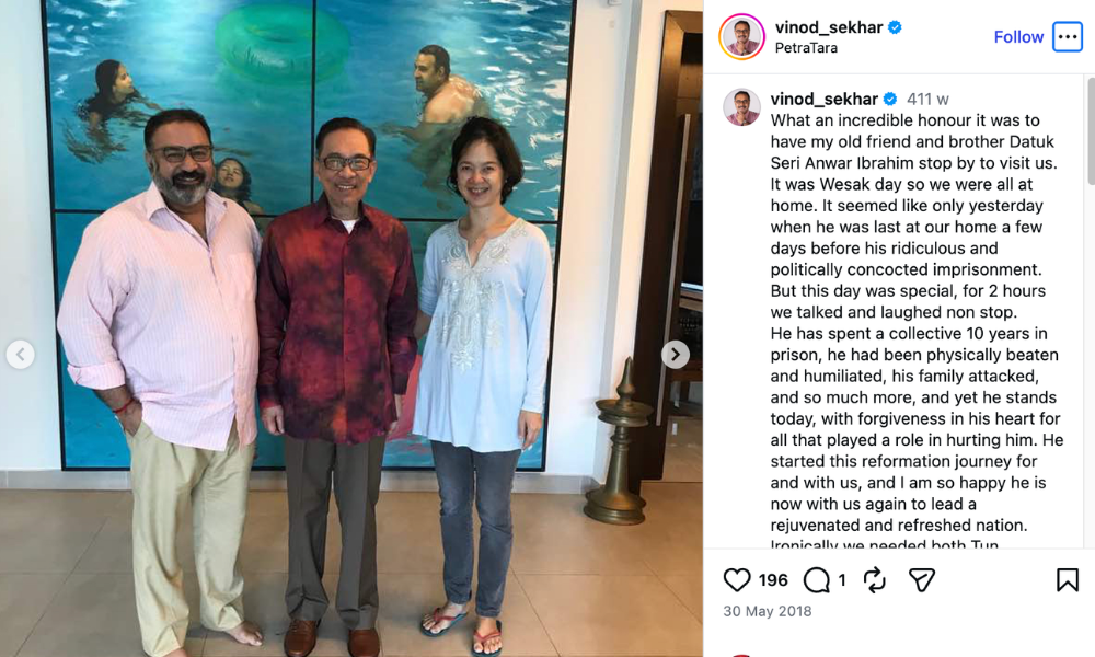 Tiga bulan kemudian – pada 17 Ogos 2018 – Vinod berkongsi satu lagi gambar dia bersama Anwar dalam satu catatan di Instagram.