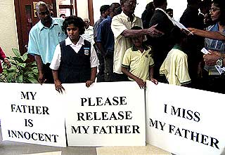 出席者包括玛诺卡兰的3名孩子,即两名孪生孩子哈里哈兰和诗娃兰吉尼(11岁)及9岁的卡能德拉。他们高举写着海报,写着“我想念我的父亲”、“请释放我的父亲”及“我父亲是无辜的”等。
