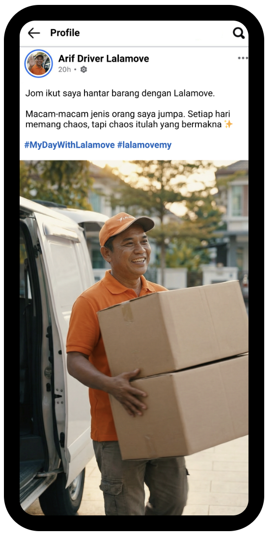 Kini, Lalamove Malaysia membuka ruang untuk semua kisah ini diceritakan menerusi kempen video terbaharunya, “My Day With Lalamove”, yang berlangsung dari 15 Disember hingga 28 Februari. Buat pertama kalinya, pemandu bukan sekadar menjadi penghantar, tetapi pencipta kandungan, pencerita, dan bintang dalam naratif harian mereka sendiri.