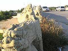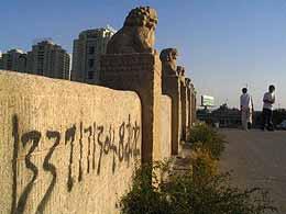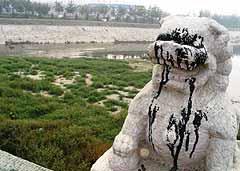 这一座石桥已经被"上柏油,每天有无数大大小小的交通工具迅弛而过。护栏的两旁杂草从石逢中苟延残喘的求"。护栏上的石狮子有的雕饰精美、栩栩如",但更多的是被涂鸦、被劈成两半。护栏上的墙壁被喷上"话号码,写着大街小巷随处可见的“办证”。