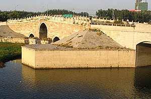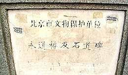 “永通桥,俗称“八里桥”,明正统十一年(1446年)建。为三""拱实心栏板石桥。桥下河"两旁有石水兽四只,雕刻"动。义'团运动时这里曾是战场。”这是永通桥被列入北京市重点文物保护单位的理"。