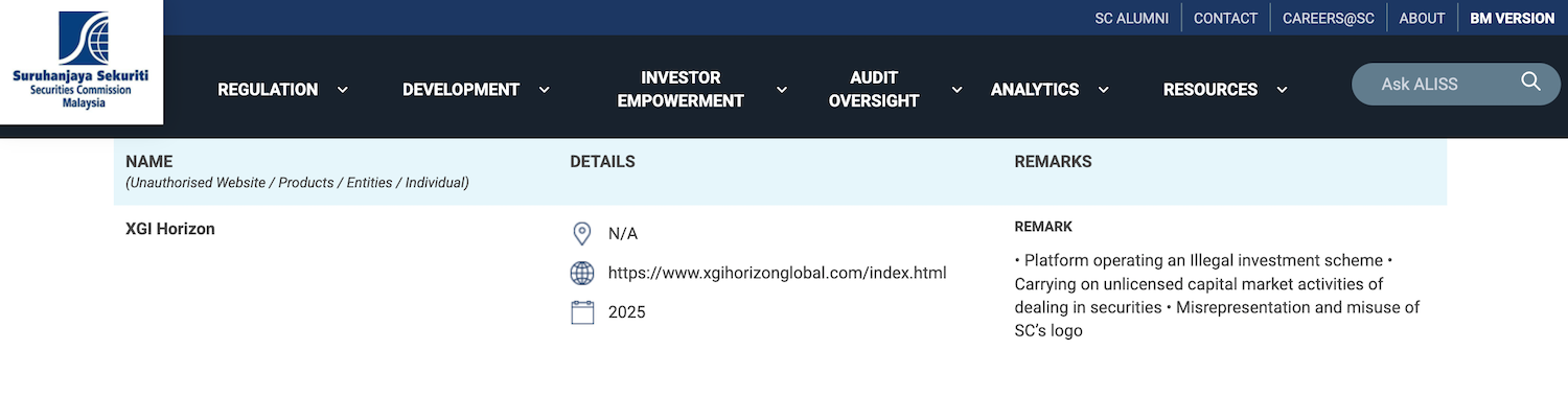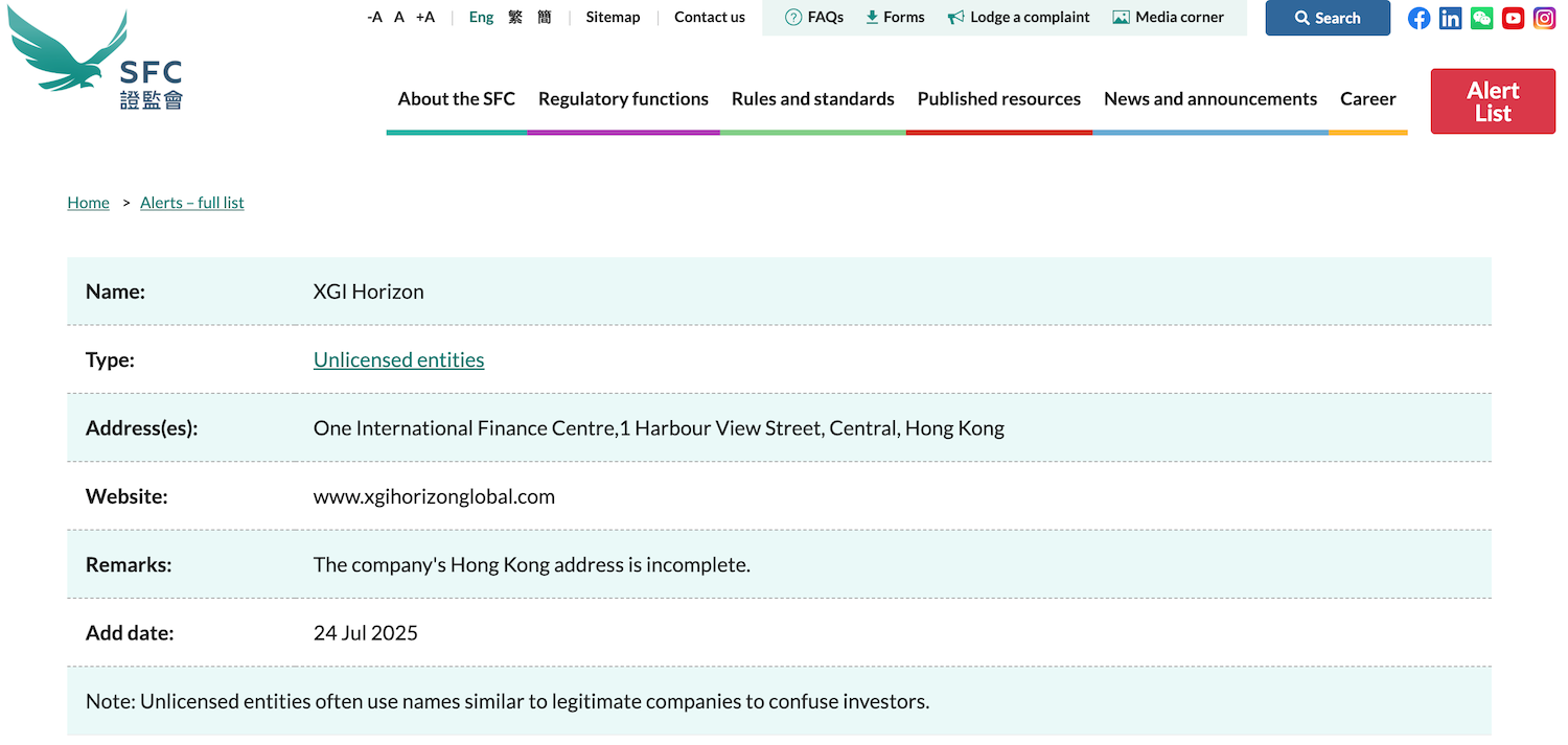 Hong Kong’s Securities and Futures Commission, in its July 24, 2025, alert list, flagged XGI Horizon as an “unlicensed entity”, meaning it is not authorised to conduct regulated financial activities in Hong Kong.