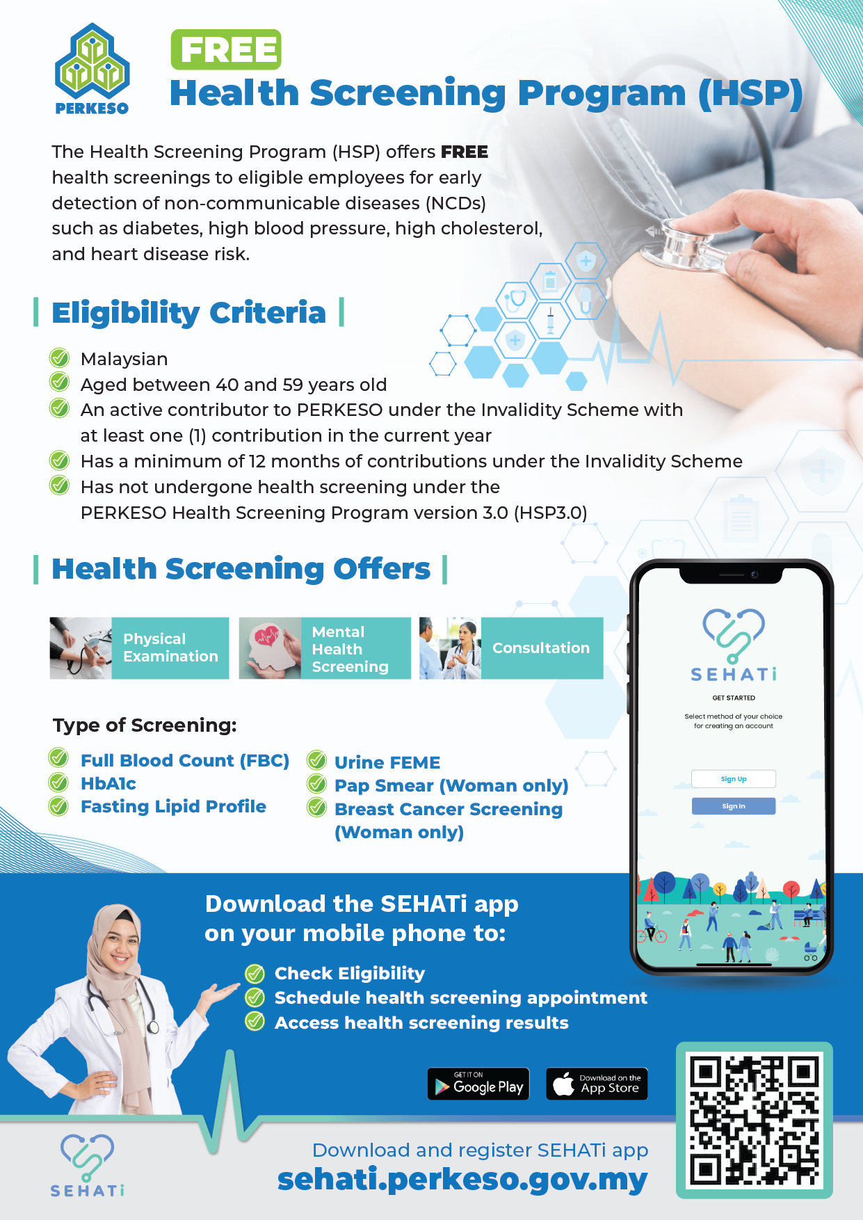 PERKESO’s Health Screening Programme (HSP), delivered through its network of clinics, plays a key role in the early detection and management of non-communicable diseases such as diabetes, hypertension, and cardiovascular conditions.